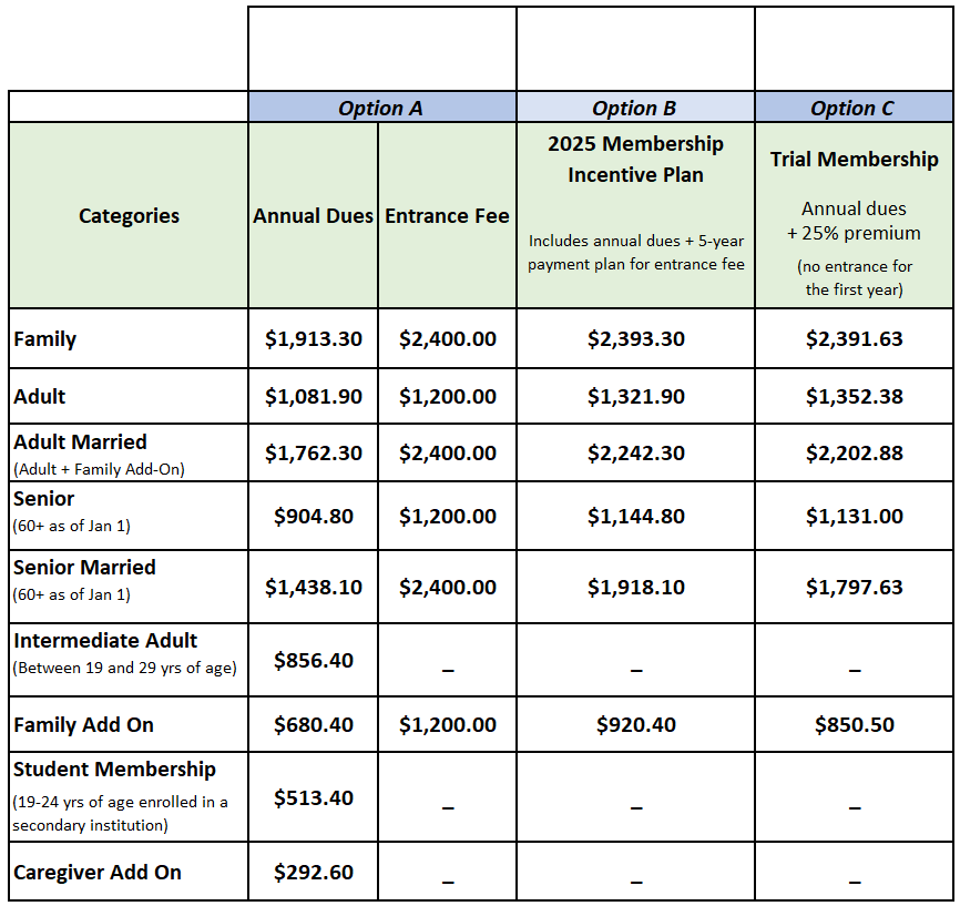 - Option C (Trial Membership): Your annual Membership Dues (with no entrance fee for the trial period) plus a 25% premium of your annual dues that can be converted to a portion of your first entrance fee payment.